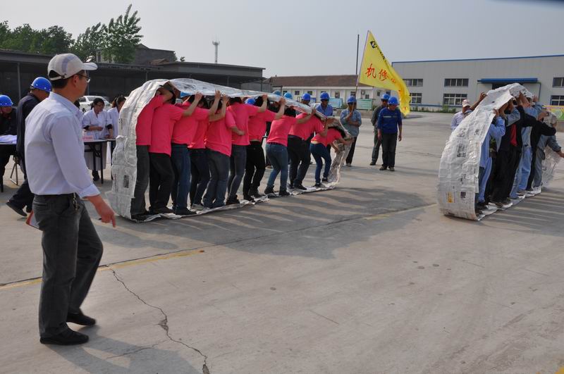 随后进行的是跳绳比赛。随着裁判哨声响起,各参赛队员使出浑身解数,女孩子舞动轻盈的身躯,手中的绳子像彩环一样上下飞舞,绳影闪闪,让人看得眼花缭乱。男选手们也不甘示弱,绳子不停地从他们的脚底一闪而过,看上去笨拙的身体此时却轻如燕飞,双脚几乎像是悬浮在空中一样,只能看到弧线闪动。 跳绳过后是无敌烽火轮比赛。这是一项考验团队成员配合协作能力的拓展游戏,各参赛团队统一指挥,明确分工,快速行动,步调一致,稳步前行,创造着一个有一个奇迹。