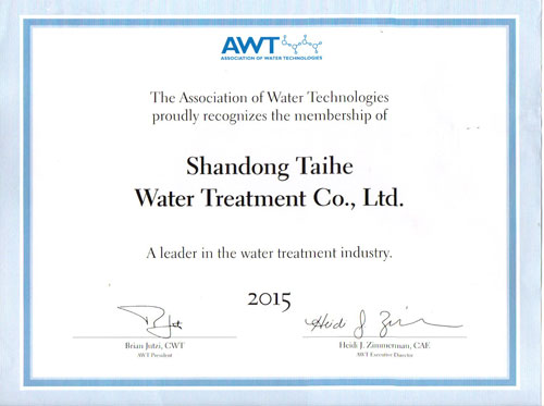 Shandong Taihe Technologies Co., Ltd., as the member of The Association of Water Technologies. (AWT) for several years, is entitled A LEADER IN THE WATER TREATMENT INDUSTRY 2015.